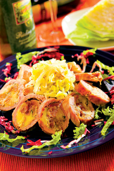 2. Pentru compoziţia de umplutură, ceapa tocată, usturoiul, carnea şi varza tocată se călesc într-o tigaie cu puţin ulei. Se condimentează cu sare şi piper, iar când se răceşte compoziţia se adaugă franzela înmuiată în lapte, gălbenuşurile, chimenul, pătrunjelul şi caşcavalul ras.
