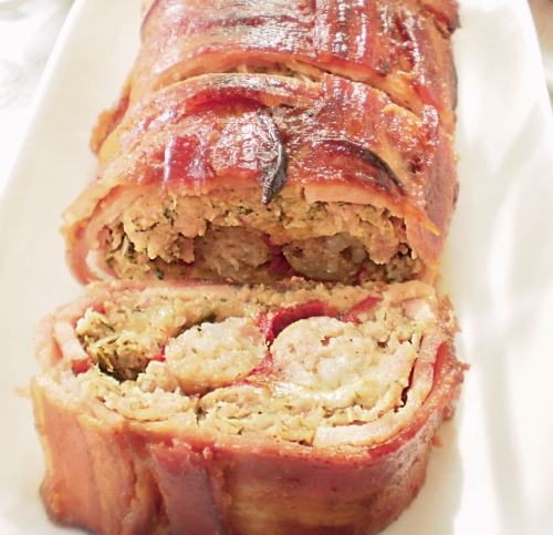 3. Pe masa de lucru se pune hârtie de copt, se asaza fâsiile de bacon care se împletesc astfel încât sa se formeze o foaie (pentru fiecare rulada se folosesc 6 fâsii de bacon), se întinde jumatate din umplutura de carne într- un strat cam de laţimea unui deget, se presara un strat de cascaval, dupa care se asaza doi cârnaciori proaspeţi, iar printre ei, fâsii de ardei capia copt. Se procedeaza la fel si pentru cea de-a doua rulada.