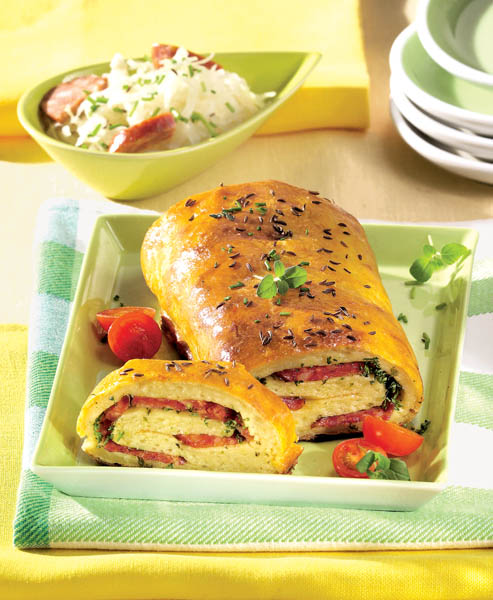 3. Se rulează cu ajutorul prosopului, se unge cu ou bătut pe toată suprafaţa şi se bagă în cuptorul bine încins. După ce s-a rumenit, se scoate din cuptor, se lasă câteva minute să se răcească şi se serveşte cu diverse salate, de roşii, sfeclă sau salată verde.