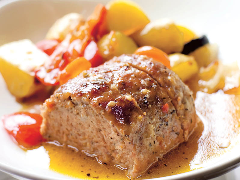 4. Se scoate rulada din cuptor, se aşază pe un platou şi se serveşte cu garnitura de cartofi ornată cu cimbru şi frunze de pătrunjel.