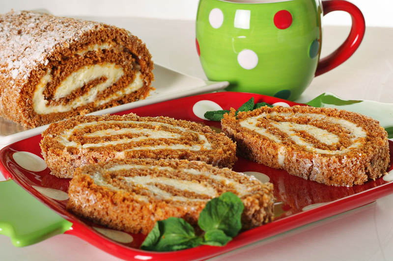 4. Separat, într-un bol, se bat gălbenuşurile cu zahărul pudră, se adaugă brânza mascarpone şi zahărul vanilat şi se umple foaia de ruladă. Se rulează şi se lasă câteva ore la rece. Se ornează cu frunze de mentă.