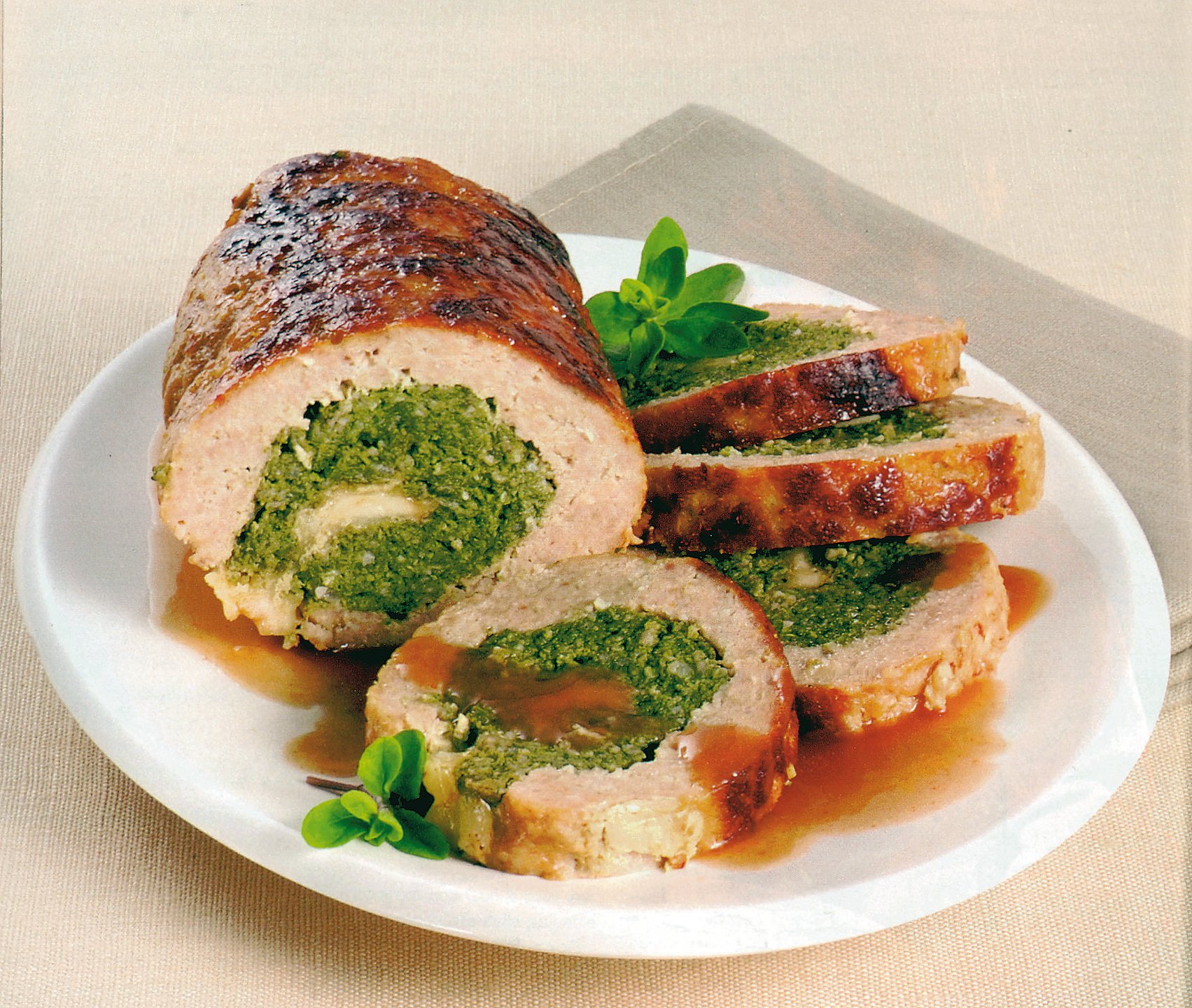 3. Se unge o hârtie de copt cu puţin ulei, apoi se întinde compoziţia de carne într-un strat dreptunghiular, lat de 20-22 cm şi gros de aproximativ un cm. Se acoperă apoi cu un strat de spanac şi se presară pe mijloc felii subţiri de şunculiţă. Se rulează atent şi se acoperă în hârtia de copt. Se pune într-o tavă unsă cu unt. Se toarnă în tavă şi vinul şi se pune în cuptorul încins, la foc potrivit, 30 minute.