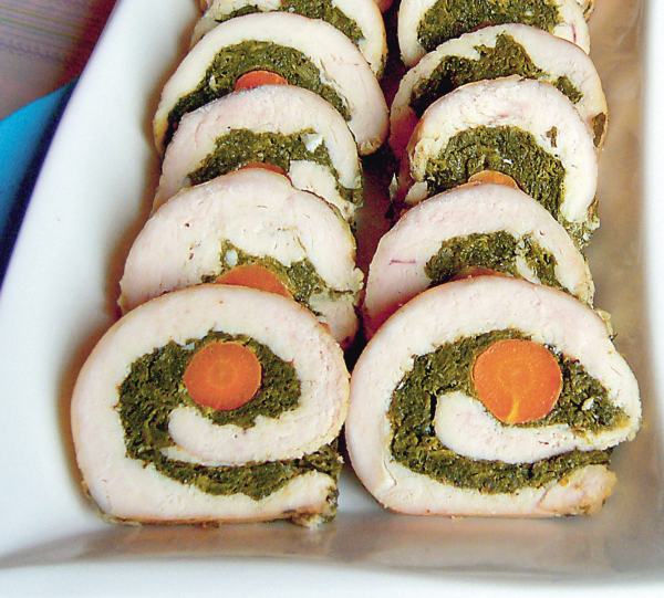 2. Spanacul se împarte în doua si se asaza peste carne. Deasupra spanacului se presara usturoiul pisat si brânza de oi rasa. Se asaza morcovii fieri pe marginea bucaţii de carne si se ruleaza cu grija sa nu iasa umplutura. Se leaga rulada cu aţa de bucatarie si se asaza într-o tava unsa cu ulei.