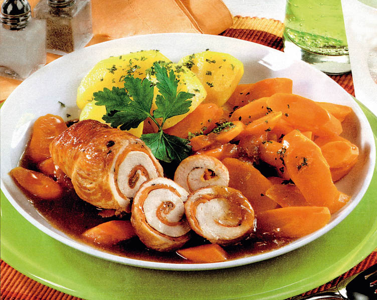 1. Morcovul, păstârnacul şi ceapa se curăţă, se spală şi se pun la fiert în 2 litri de apă, cu puţină sare. Cartofii se fierb în apă cu sare. Pieptul de pui se taie pentru a putea fi umplut. Se dă cu sare şi piper pe ambele părţi, apoi se lasă la rece 15 minute.