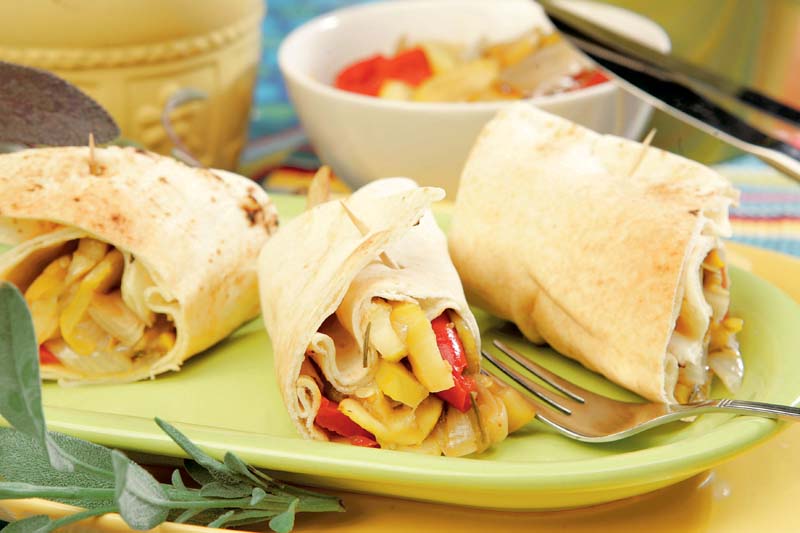 3. Cele 4 lipii se umplu cu porţii egale de piept de pui, ardei graşi, castraveţi, măsline şi sos de iaurt. Se rulează şi se servesc imediat.