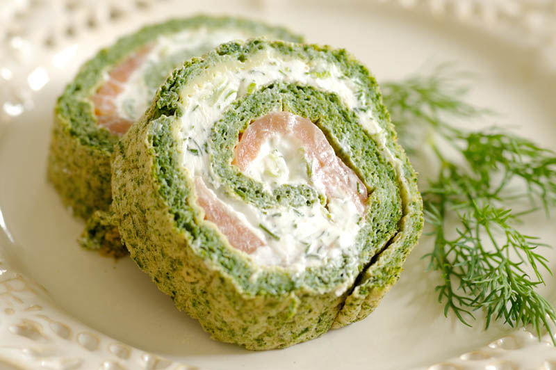 4. După ce s-a răcit omleta, se întinde crema de brânză, se aşază feliile de somon şi se rulează astfel încât să nu se rupă. Se lasă la rece aproximativ o oră.