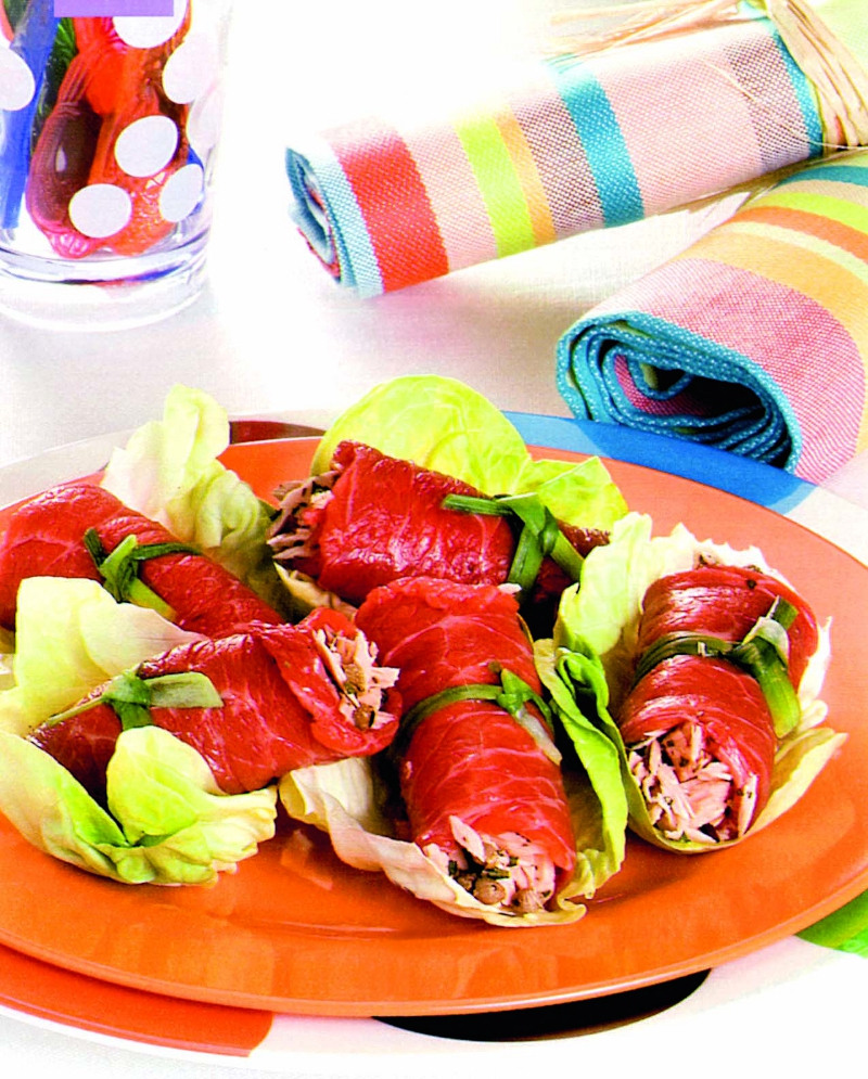 3. Pe fiecare felie de somon se pune câte o lingură din compoziţia de ton şi se rulează cu atenţie. Se leagă apoi fiecare rulou cu câte o fâşie de praz şi se aşază pe un platou ornat cu salată verde.