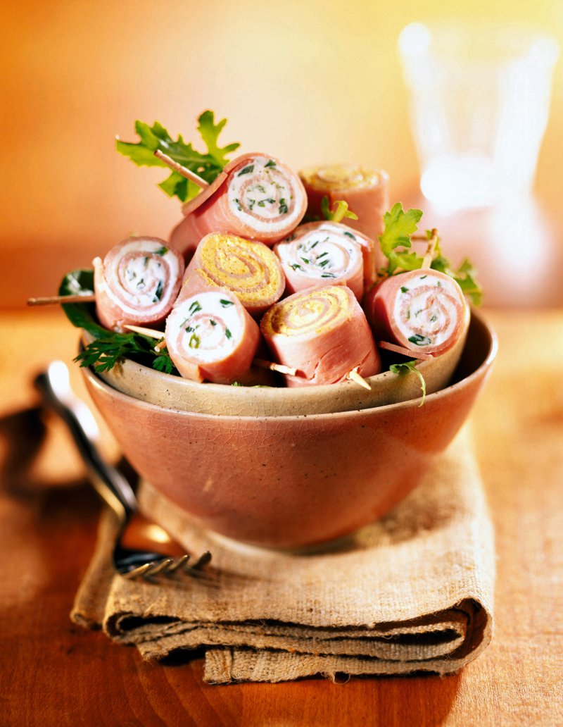 2. Pe jumătate din feliile de şuncă se pun fâşii de omletă egale ca lăţime cu feliile de şuncă şi se formează rulouri care se fixează cu scobitori.