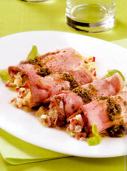 4. Friptura se taie felii subţiri de 4-5 mm, pe care se pun 1-2 linguri salată de crudităţi şi se rulează.