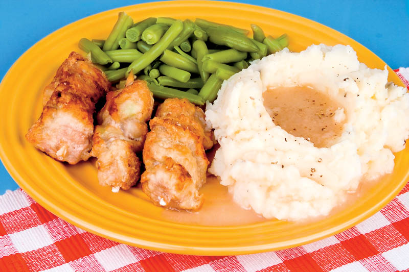 4. Rulourile din piept de pui cu ciuperci se pot servi cu piure de cartofi şi sote de fasole verde.