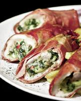 3. Compoziţia se lasă câteva minute să se răcorească şi se pregătesc feliile de piept. Se umplu cu compoziţia de ciuperci, se rulează, se înfăşoară în bacon şi se prind cu scobitori.