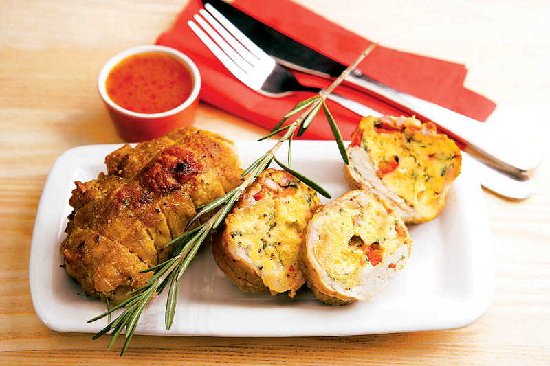 1. Carnea se desface în felii subţiri care să se poată rula. Se stropesc cu zeamă de lămâie, se condimentează cu sare, piper şi rozmarin, se lasă la rece jumătate de oră.