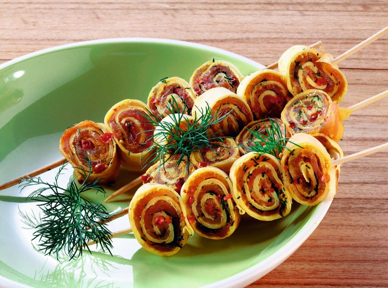 3. Fiecare clătită se unge cu sos de muştar. Deasupra se aşază felii subţiri de peşte sau de jambon, apoi se rulează strâns. Se lasă la rece cam o oră, apoi se taie rondele şi se înfig, la fel ca frigăruile, pe beţe din lemn. Se servesc reci, garnisite cu mărar.