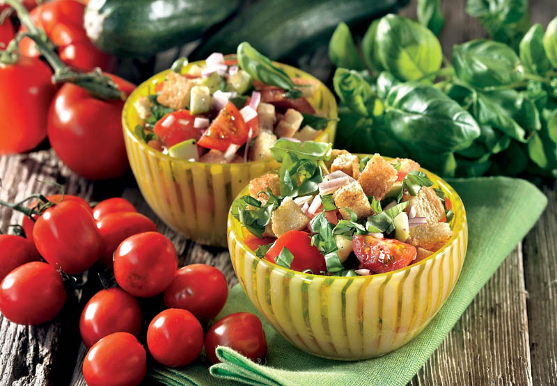 4. Se spală roşiile, ardeii, se şterg şi se taie cubuleţe, apoi se pun în bolul cu verdeaţă, alături de crutoane şi de sos. Se amestecă uşor să nu se zdrobească ingredientele şi se serveşte proaspătă.