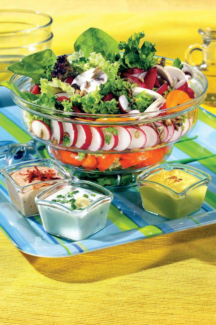 2. Seminţele de floarea-soarelui se prăjesc în unt şi se presară peste salată. Salata obţinută se serveşte dreasă cu un sos de brânză sau de iaurt ori cu oţet balsamic. Fiecare dintre sosuri se obţine prin amestecarea ingredientelor.