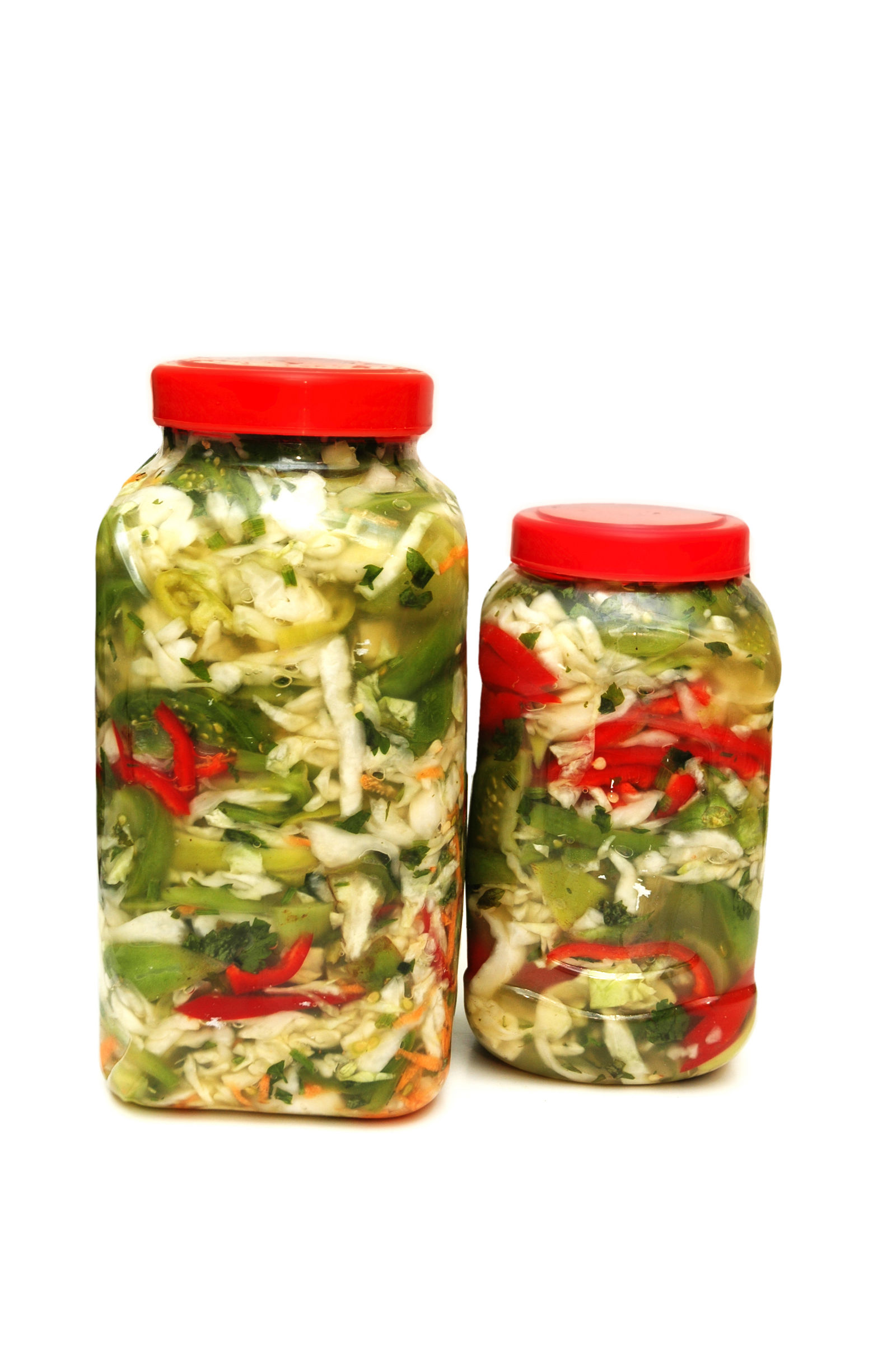 4. Amestecul de legume se pune în borcane, îndesându-se bine cu lingura. Intercalat, se pun frunzele de ţelină şi de cimbru şi căţeii de usturoi. Deasupra, după ce s-a umplut borcanul, se pun câteva crenguţe de mărar şi fâşii de hrean. Se toarnă baiţul până aproape de gura borcanului şi se închide etanş, de preferat cu un capac cu filet. Odată închise, borcanele se depozitează într-un spaţiu răcoros şi întunecat (cămară, beci).