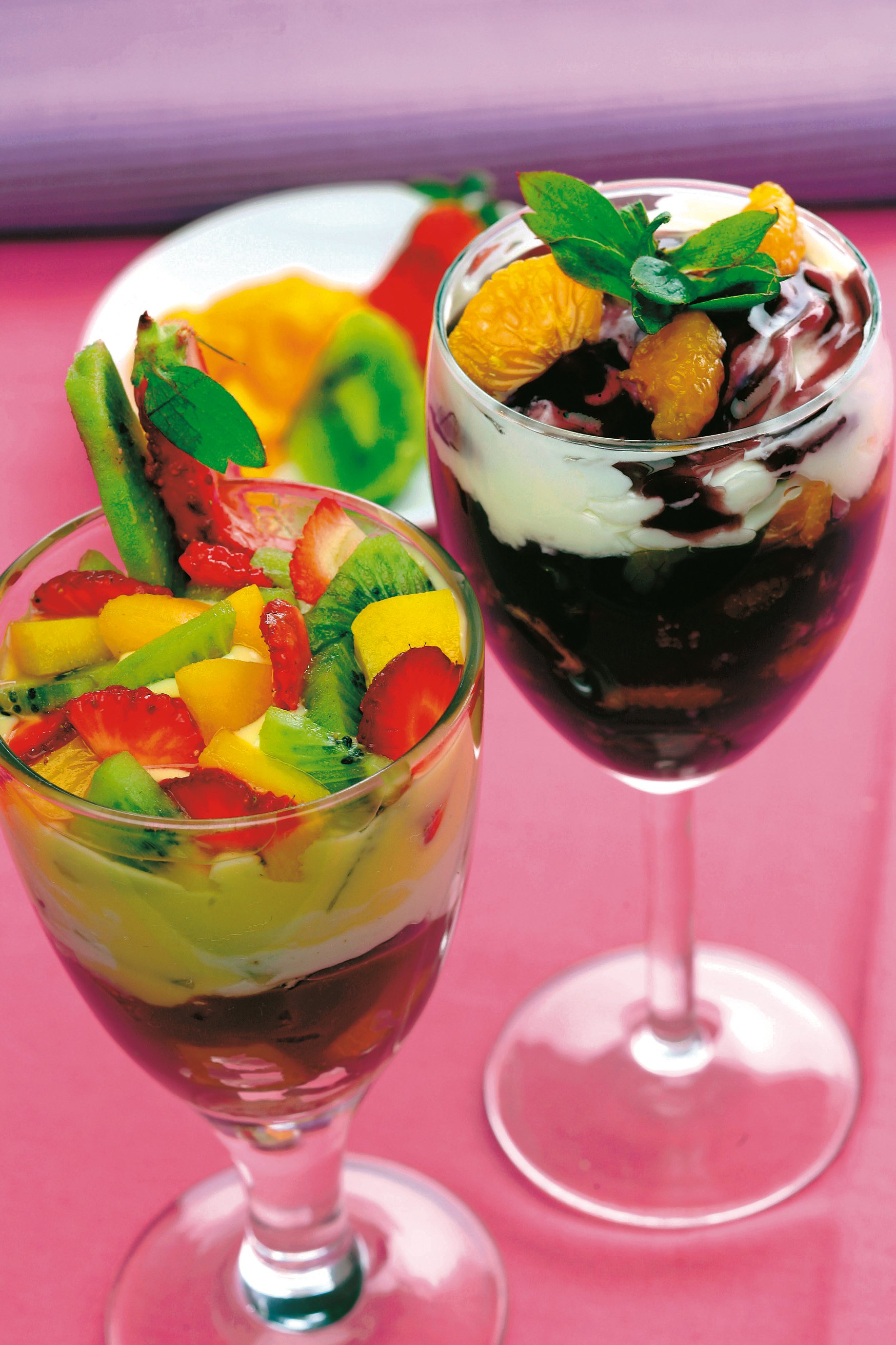 3. Fructele se pun în cupe peste budincă şi se ornează cu frişcă şi felii de portocale. Opţional, se pot pune şi frunze de mentă pentru un aspect plăcut.
