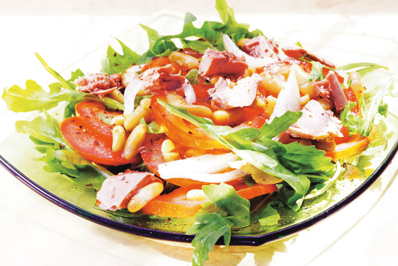 2. Salata se curăţă şi se spală. Roşiile şi ceapa se spală şi se taie rondele. Toate se pun într-un castron şi se dau cu un praf de sare şi piper. Se adaugă apoi fasolea boabe şi şunculiţa. Se stropeşte cu oţet în care s-a dizolvat zahărul şi ulei. Se amestecă uşor şi se pune în farfurii.