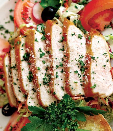 4. Se condimentează cu sare şi piper, cu oţet balsamic şi ulei de măsline. Brânza feta se adaugă la sfârşit, ca să nu se fărâme. Se scoate pieptul de curcan din cuptor, se lasă să se răcească şi se feliază. Feliile de piept se aranjează pe un platou şi se servesc cu salată şi crutoane aromate cu unt şi sare. Se ornează cu pătrunjel proaspăt.