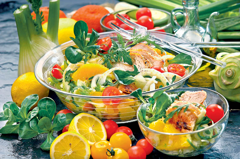 2. Între timp, friptura se taie cubuleţe. Se pune în salată şi se amestecă. La sfârşit se adaugă portocala şi roşiile tăiate felii. Se presară verdeaţă tocată şi se serveşte imediat