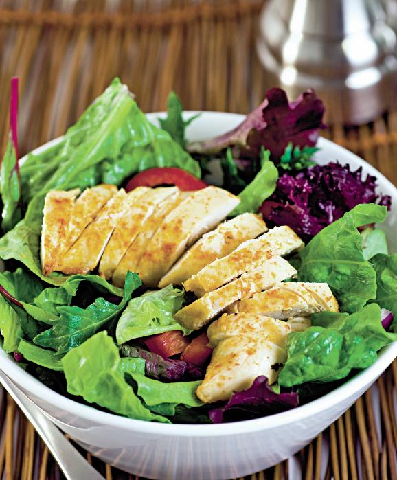 4. Se pregăteşte sosul din ulei, oţet, zahăr, sare, piper şi vin şi se adaugă peste salată. Pe deasupra, se presară feliuţele de piept. Se serveşte cu crutoane cu usturoi.