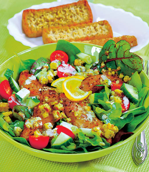 1. Se spală frunzele de salată şi se lasă să se scurgă pe un prosop absorbant de bucătărie. Se aranjează într-un bol şi se presară crutoanelerumenite, roşiiletăiate, castraveciorii şi se lasă câteva minute la rece.
