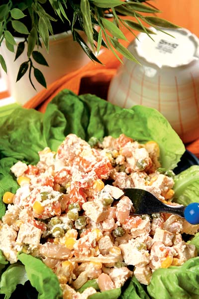 3. Într-un castron suficient de mare se pun legumelele fierte, soia, maioneza, muştarul, ceapa şi pătrunjelul. Totul se amestecă uşor şi se condimentează, dacă mai este necesar.