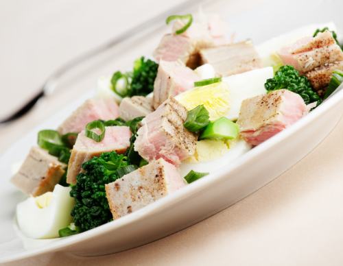 4. Într-un bol mai mare, se pun toate ingredientele, pastele, buchețelele de broccoli, tonul, porumbul și se condimentează cu sare și piper, după gust. Se adaugă uleiul de măsline, verdeața tocată mărunt și zeama de lămâie. Salata se servește la aperitiv.