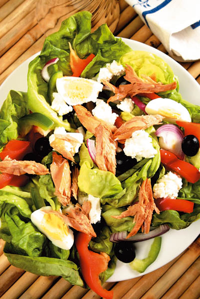 3. Într-un castron potrivit de mare se pun mai întâi frunzele de salată verde, apoi ceapa, ardeiul gras şi castravetele. Se stropesc cu sosul pregătit şi se amestecă uşor. Se adaugă peştele, ouăle, măslinele şi brânza, apoi se poate servi.
