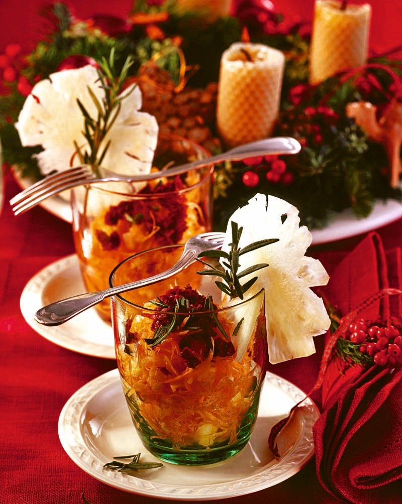2. Între timp, se rade coaja de portocale şi se adaugă peste ananas. Portocalele se storc, iar sucul obţinut se toarnă şi el peste ananas. Se amestecă puţin, cât să capete aromă de portocală.