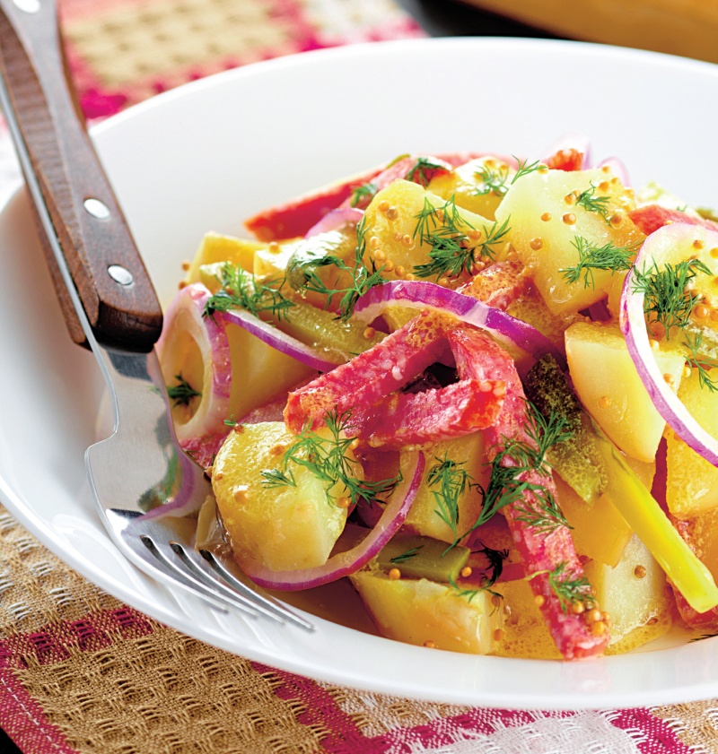 3. Ceapa se taie rondele care se răsfiră peste cartofi iar salamul se taie fâşii. Se amestecă uşor şi se aduce salata la masă presărată cu mărar.