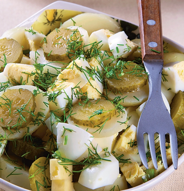 4. Se adaugă caşcavalul tăiat cuburi, cartofii curăţaţi şi feliaţi şi ouăle curăţate şi tăiate cuburi. Se presară mărarul şi apoi se pune uleiul. Se amestecă şi se serveşte imediat.