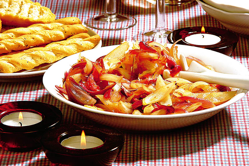 2. Ceapa se curăţă, se spală şi se taie solzişori. Se pune într-un castron, se presară cu puţină sare şi se stropeşte cu sos picant şi vin îndoit cu apă. Se amestecă uşor să ajungă toată ceapa în sosul format, se acoperă vasul şi se păstrează la rece 10-15 minute.