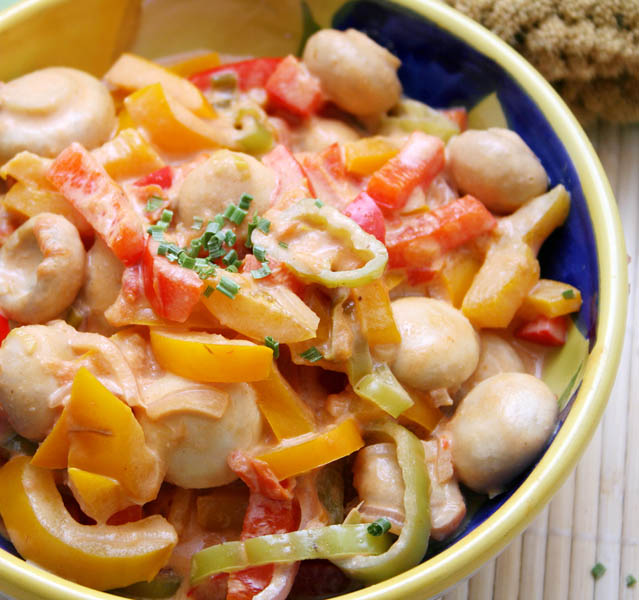 2. Se taie ceapa şi ardeii şi se rumenesc în uleiul încins, apoi se adaugă ciupercile şi se lasă să fiarbă înăbuşit. Se pune sare şi piper, după gust, şi se acoperă cu un capac.