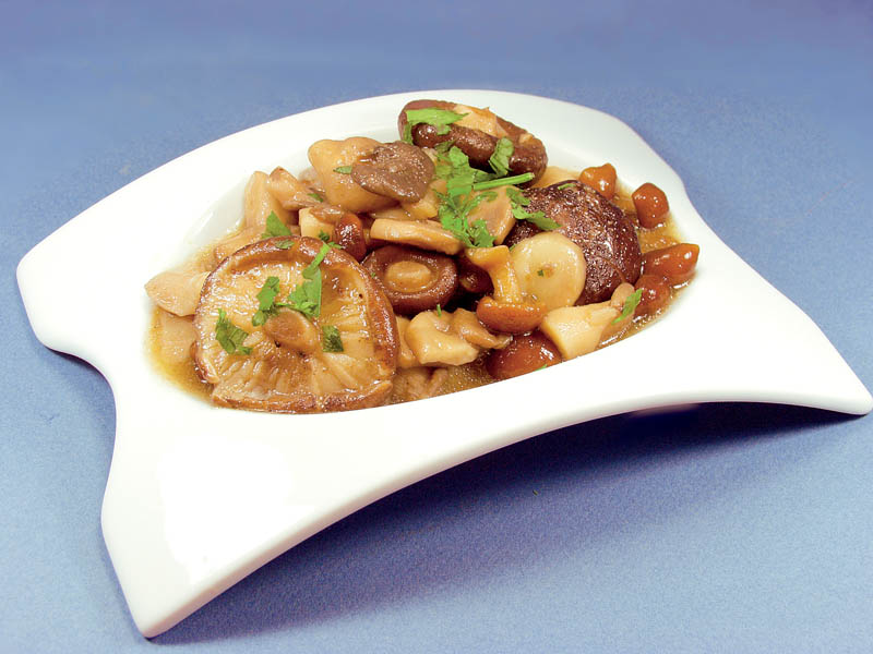 4. Ciupercile opărite se amestecă cu saramura şi se lasă câteva ore să se răcească bine. Se spală pătrunjelul verde, se toacă mărunt şi se pune peste ciuperci. Această salată se serveşte rece sau la temperatura camerei, cu un pilaf sau o altă mâncare de post.