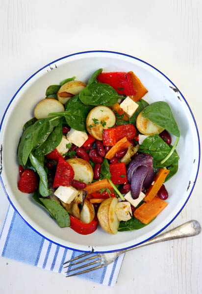 1. Pentru început, se pun morcovii şi cartofii la fiert cu puţină sare. Se spală frunzele de spanac şi se pun să se scurgă într-o sită. Între timp, se pregătesc şi celelalte ingrediente. Se fierbe fasolea, se taie roşiile şi ardeiul cubuleţe de mărime medie şi se pun într-un bol. Ceapa se taie foarte subţire să nu se simtă în salată decât aroma.