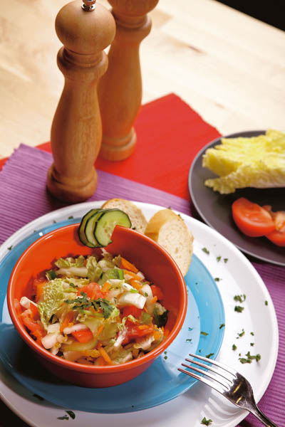 2. Ţelina şi morcovii se curăţă, se spală, se dau pe răzătoarea mare şi se pun separat, în alt castron. Se adaugă castraveţii şi roşiile tăiate felii, măslinele, varza înmuiată, mărarul şi pătrunjelul verde tocat. Se stropeşte cu zeama de lămâie şi uleiul, apoi se amestecă şi se potriveşte la gust cu sare şi piper.
