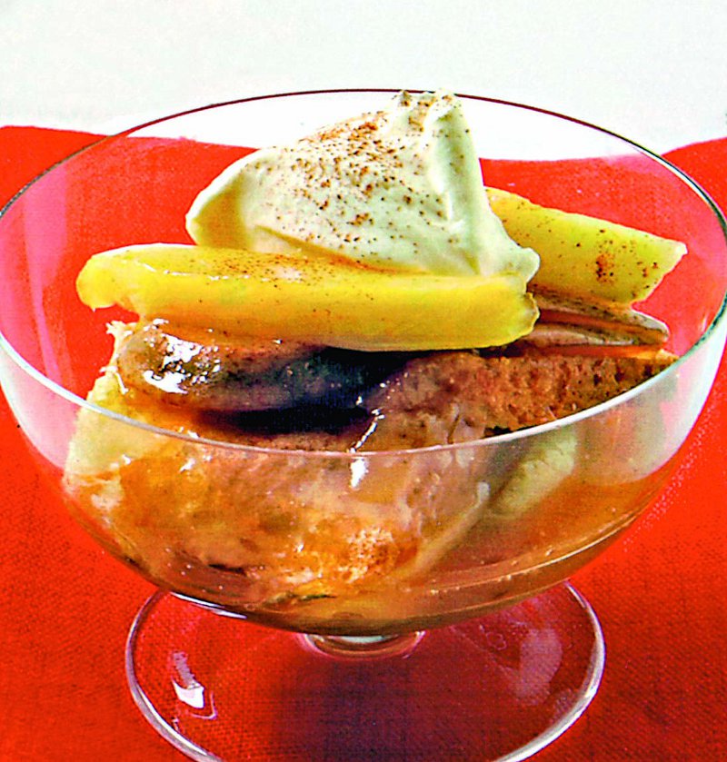 Un grepfrut şi 2 mandarine se taie felii şi se amestecă. Se adaugă jumătate de cutie de compot de ananas şi 100 g curmale. Separat se freacă 200 g mascarpone cu 100 g zahăr pudră şi 10 ml brandy, până se obţine o compoziţie cremoasă, iar 300 g cozonac se taie felii şi se gratinează. Fructele şi cozonacul se împart în 4 cupe, adăugând apoi câte o lingură de cremă cu mascarpone şi un praf de scorţişoară.