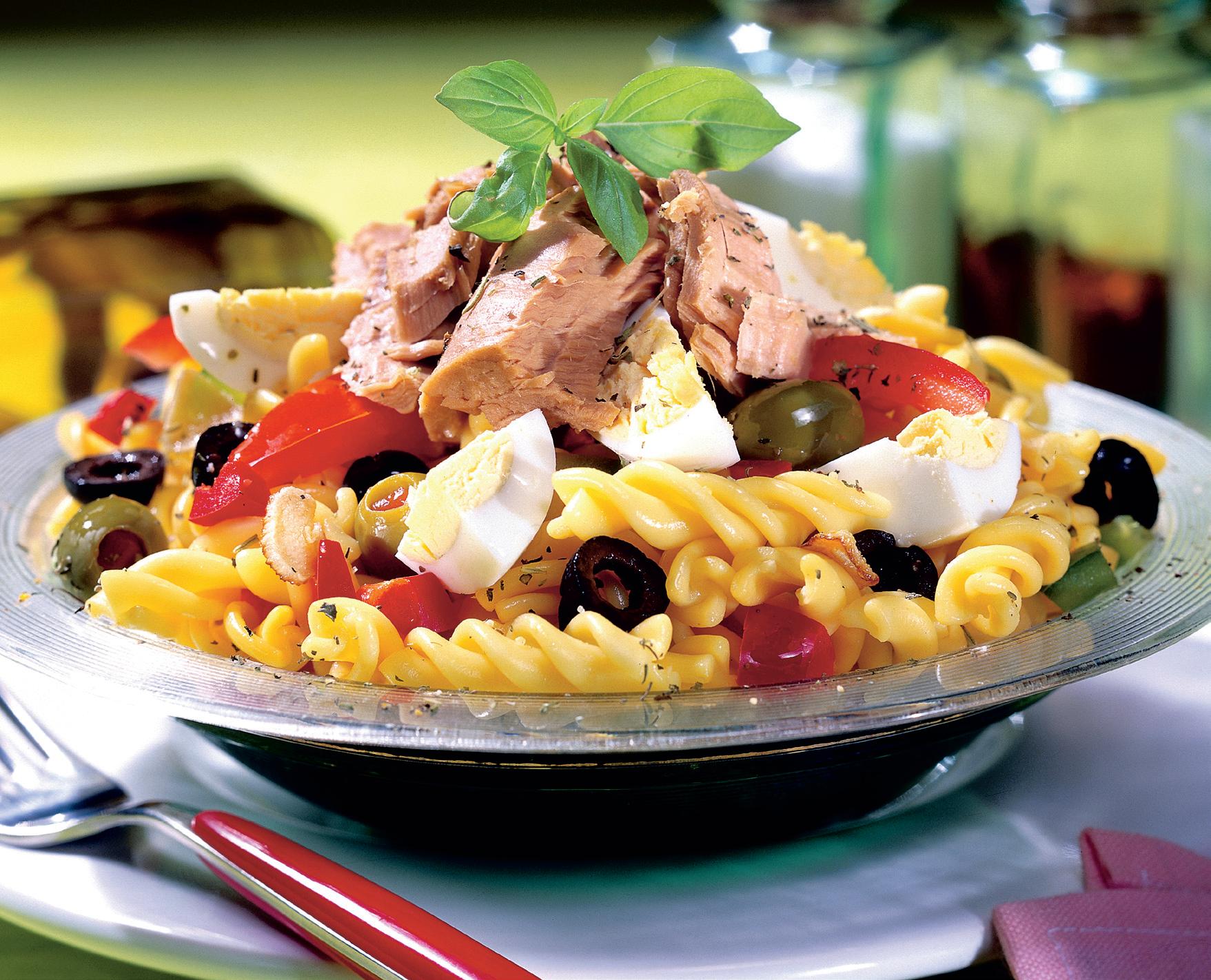 2. Se curăţă, se spală şi se taie felii ardeii şi roşiile. Se pun peste paste. Se adaugă şi măslinele, peştele din conservă şi ouăle fierte tăiate în sferturi.