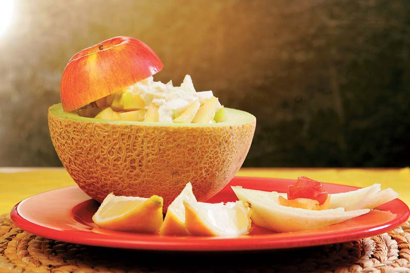 1. Stafidele se curăţă, se spală cu apă călduţă, se lasă la scurs pe o hârtie absorbantă, apoi se pun într-un castron şi se stropesc cu rom. Pepenii galbeni  se taie în jumătăţi şi se curăţă de seminţe. Merele se spală, se curăţă de coajă, de sâmburi şi se taie cubuleţe. Se pun în jumătăţile de pepene, se stropesc cu mierea de albine diluată cu zeama de la o lâmăie şi se pun la rece 15 minute.