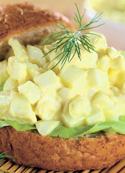 4. Pe fiecare chifla taiata în doua se asterne o frunza de salata si se repartizeaza salata cu oua. Se pune marar si se serveste.