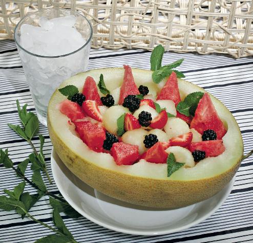 3. Se amestecă fructele roşii cu sferele de pepene galben şi cu triunghiurile de pepene roşu, se aranjează din punct de vedere estetic şi se stropesc cu puţin vin alb dulce şi aromat.