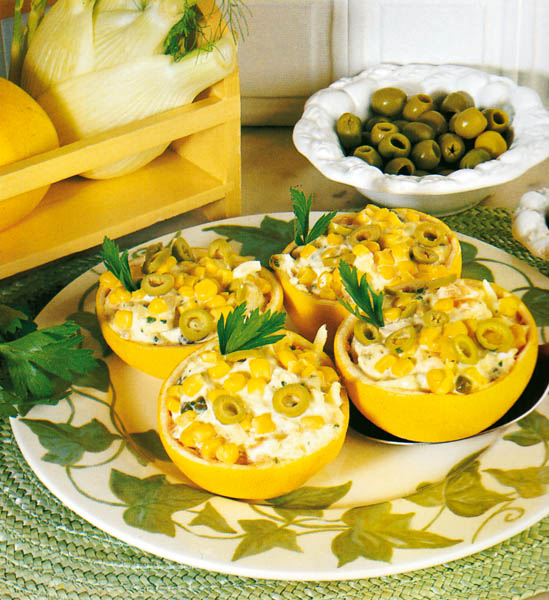 2. Se amestecă într-un castron miezul de grepfrut cu peştele afumat, măslinele, hreanul ras, caperele, porumbul fiert şi pătrunjelul verde tocat mărunt. Se păstrează la rece 10-15 minute.
