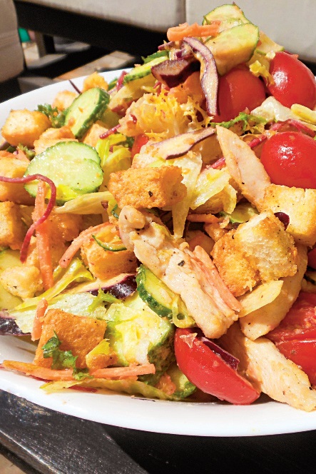 3. Bucățelele de pui, crutoanele, salata, roșiile cherry tăiate jumătăți și feliile de castraveții se amestecă bine.