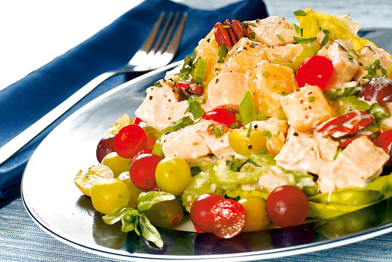 3. Separat, se curăţă strugurii, se spală şi se lasă la scurs. O parte se taie rondele şi o parte din boabe rămân întregi. Se pun într-un bol şi se amestecă cu pieptul de pui tăiat cubuleţe, cu cartofii şi cu ouăle fierte.