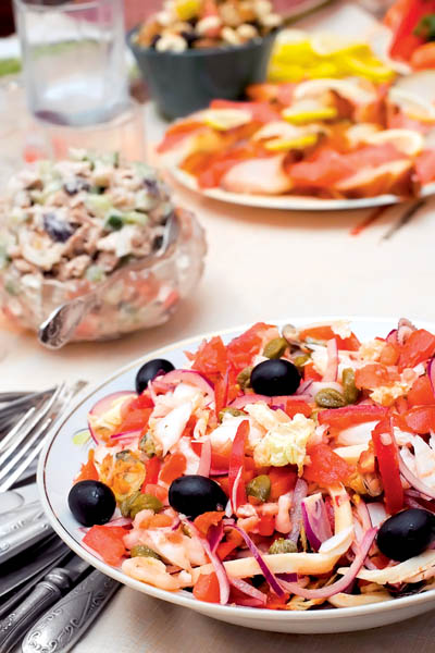 2. Pastrama din piept de pui se taie cubuleţe, iar roşiile şi ardeiul gras se taie felii. Se pun în castronul cu varză tocată, apoi se adaugă măslinele şi caperele murate. Se potriveşte la gust cu sare şi piper, se acoperă şi se lasă la rece un sfert de oră.