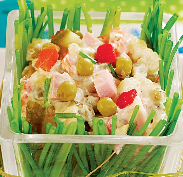 3. Muraturile scurse se taie cubuleţe, cartofii fierţi si curaţaţi se taie rondele si se amesteca cu restul legumelor şi maioneza făcută dintr-un gălbenuş fiert, unul crud, ulei şi muştar.