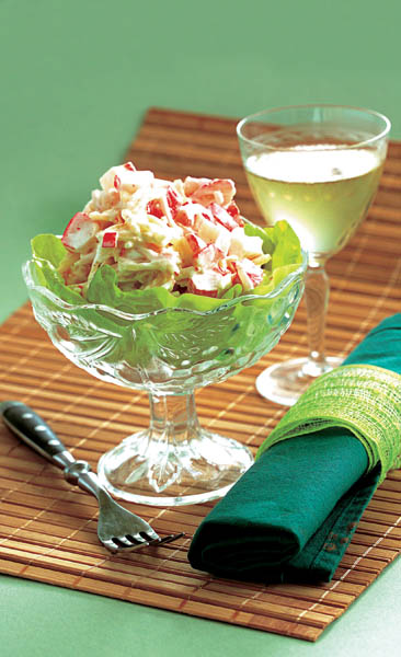 4. Între timp, se pregătesc 4 cupe transparente, iar salata verde se spală şi se lasă să se usuce. În fiecare cupă se pun câteva foi de salată şi 3-4 linguri salată preparată. Se serveşte imediat, ca aperitiv.