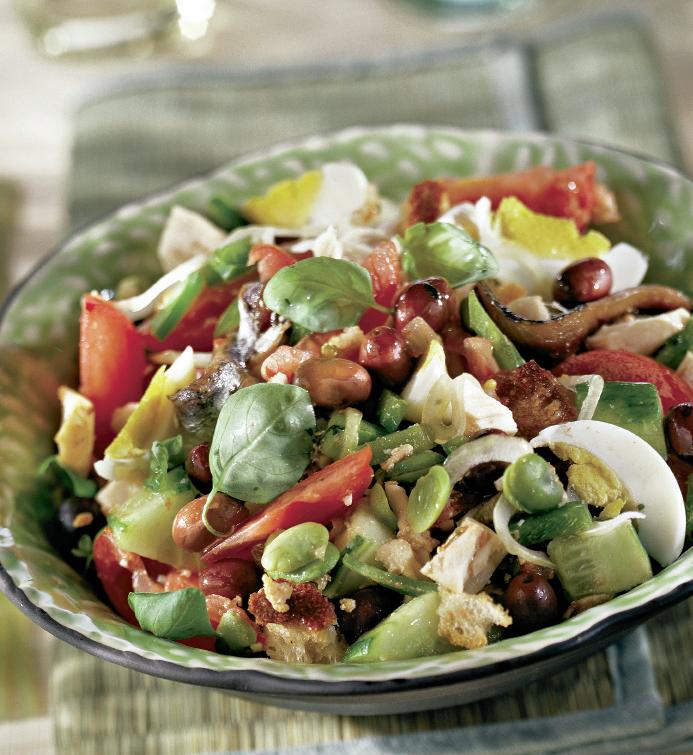 1. Se fierb ouăle şi se lasă la răcit. Se taie feliile de pâine cubuleţe. Se încing 2-3 linguri de ulei de măsline într-o tigaie, se pun bucăţelele de pâine şi se condimentează cu sare şi piper. Apoi se lasă câteva minute până se fac crocante şi rumene.