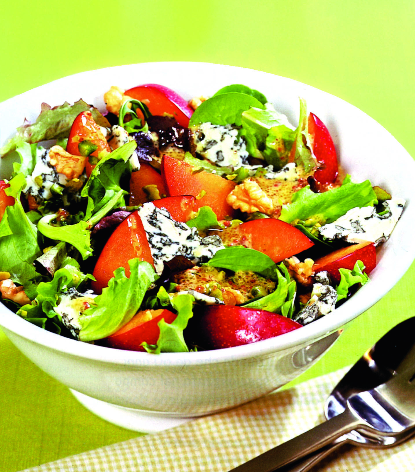 1. Se spală bine verdeţurile şi merele. Frunzele se rup, iar merele se taie felii. Se pun toate într-un castron mare, pentru salată. Se adaugă cuburi de gorgonzola, nucă, fistic şi se amestecă uşor.